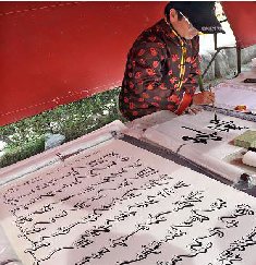 在河南省开封市翰园碑林景区内,辟有一块专供书画名家展示各种书法、绘画绝活的场地。这里推出的沙书、口书、勺书、反书、指画等,让市民和游客们大开眼界。新华社记者王颂摄